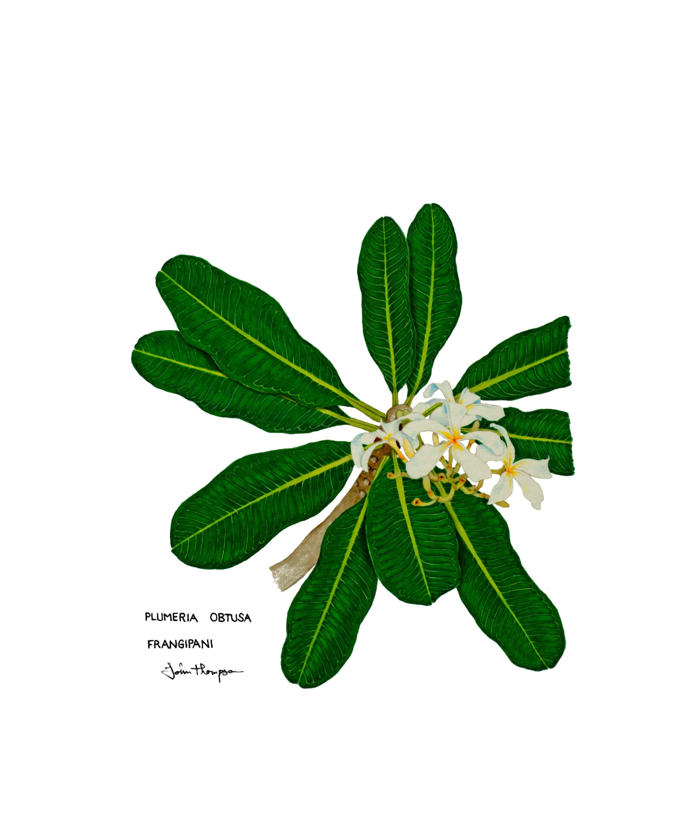 Illustration of Plumeria obtusa plant with green leaves and white flowers, labeled 'Plumeria obtusa Frangipani'.
