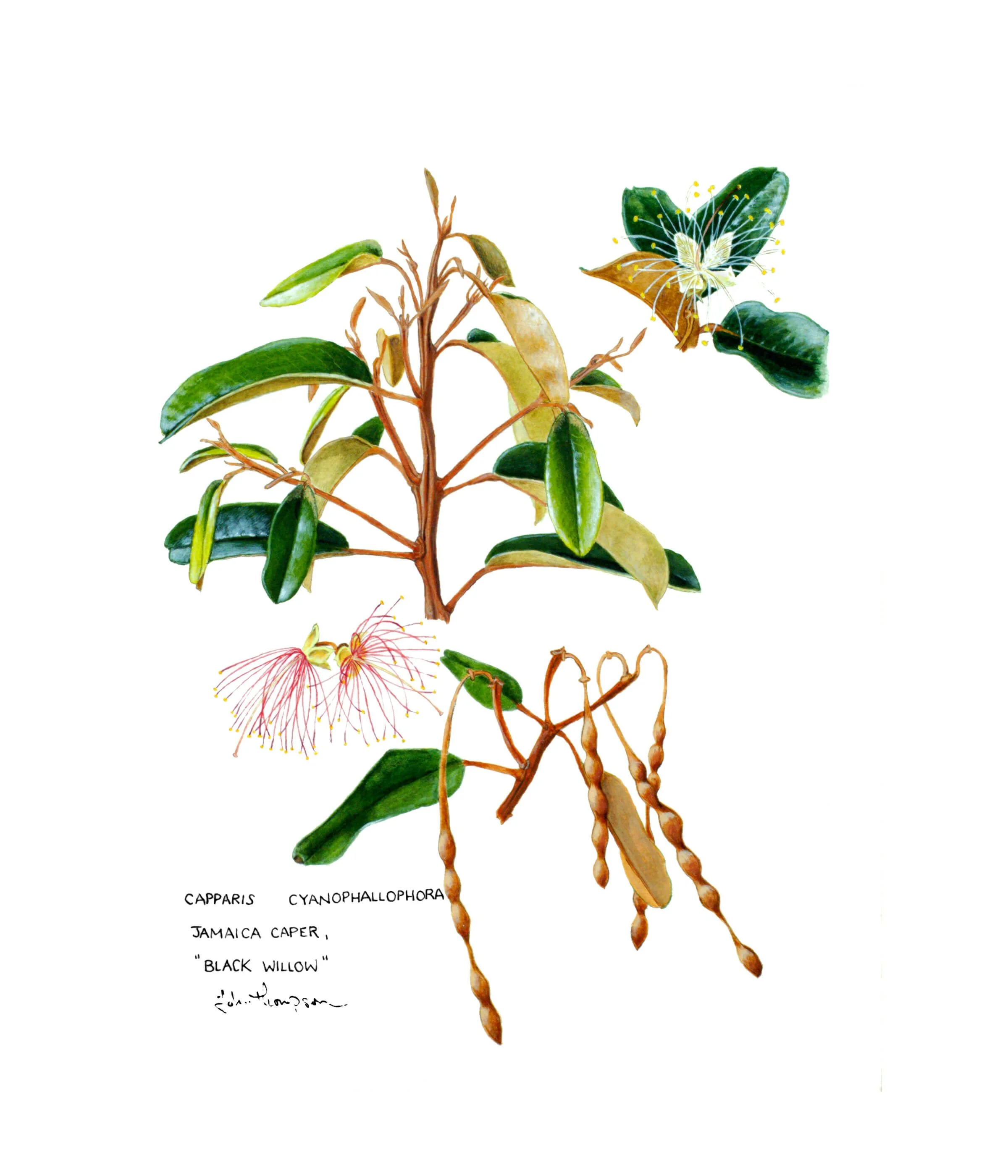 Illustration of Capparis cynophallophora plant, also known as Jamaica Caper or Black Willow, with leaves, flowers, and seed pods.
