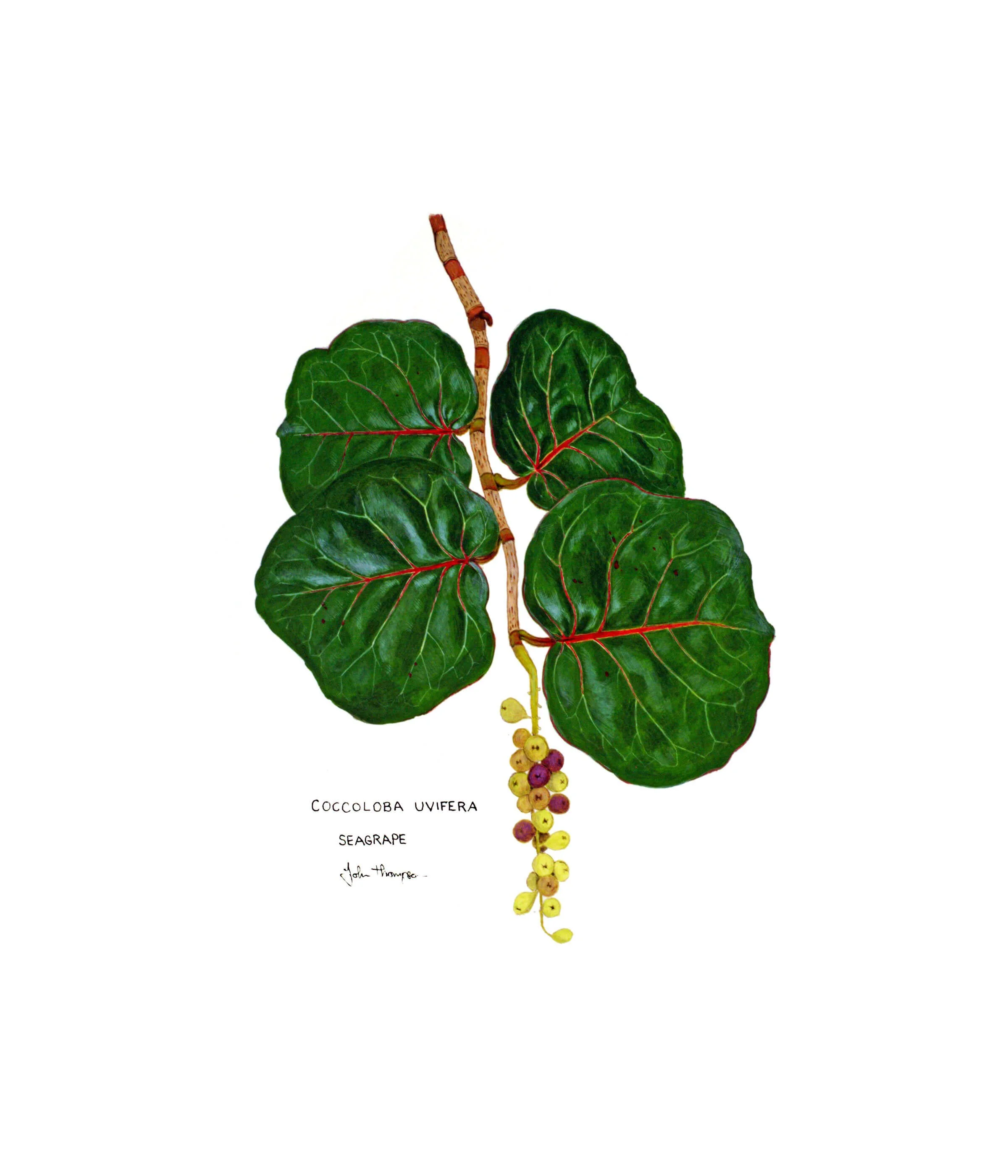 Illustration of Coccoloba uvifera (seagrape plant) with green leaves and grape-like fruits on a white background. Includes handwritten text labels.