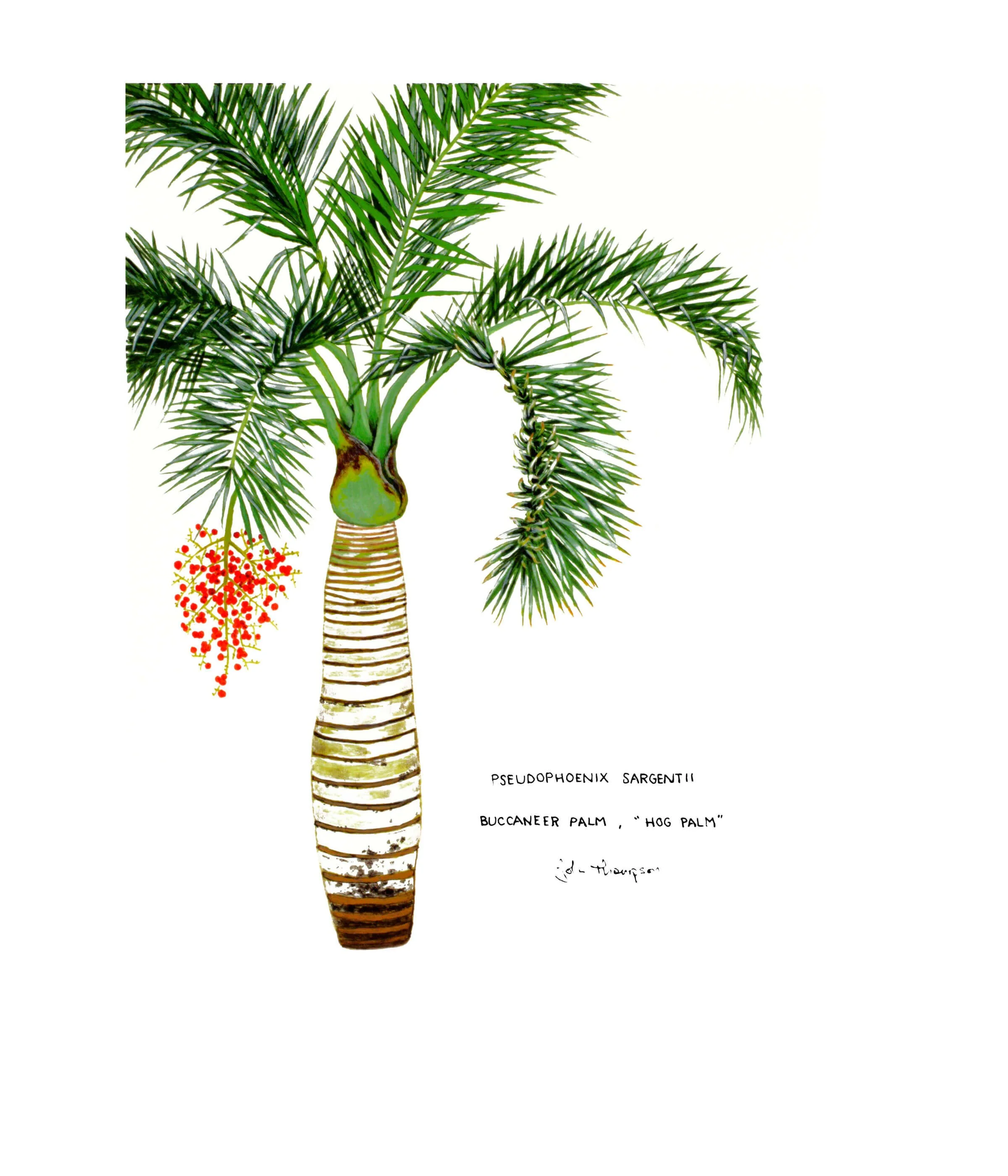 Illustration of Pseudophoenix sargentii, known as the Buccaneer Palm or Hog Palm, showing green fronds and red clusters of fruit.