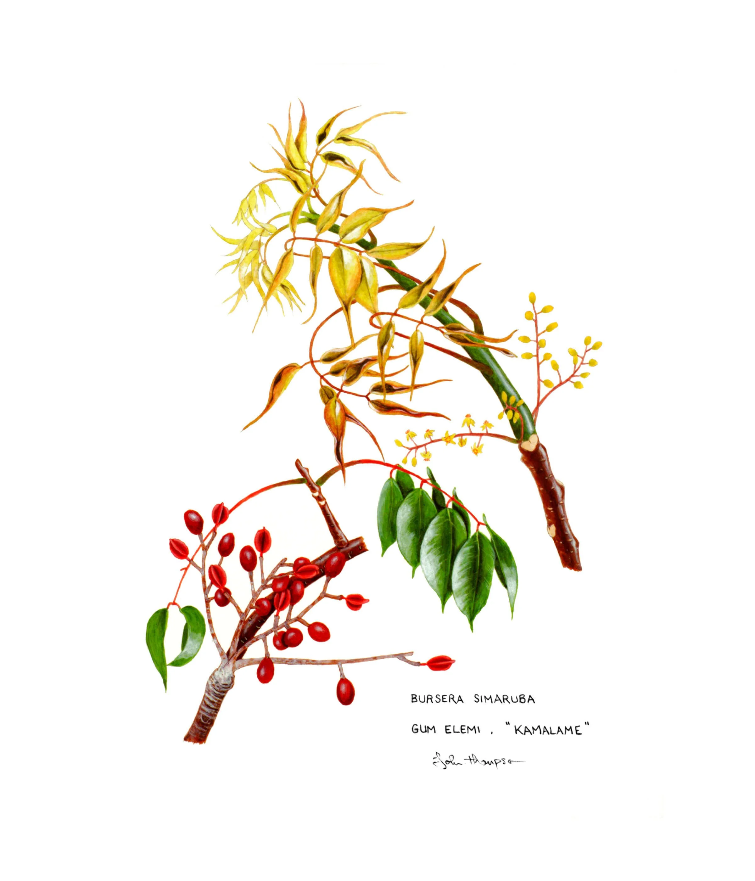 Botanical illustration of Bursera simaruba, also known as Gum Elemi or Kamalame, featuring detailed branches, leaves, and red fruit clusters.
