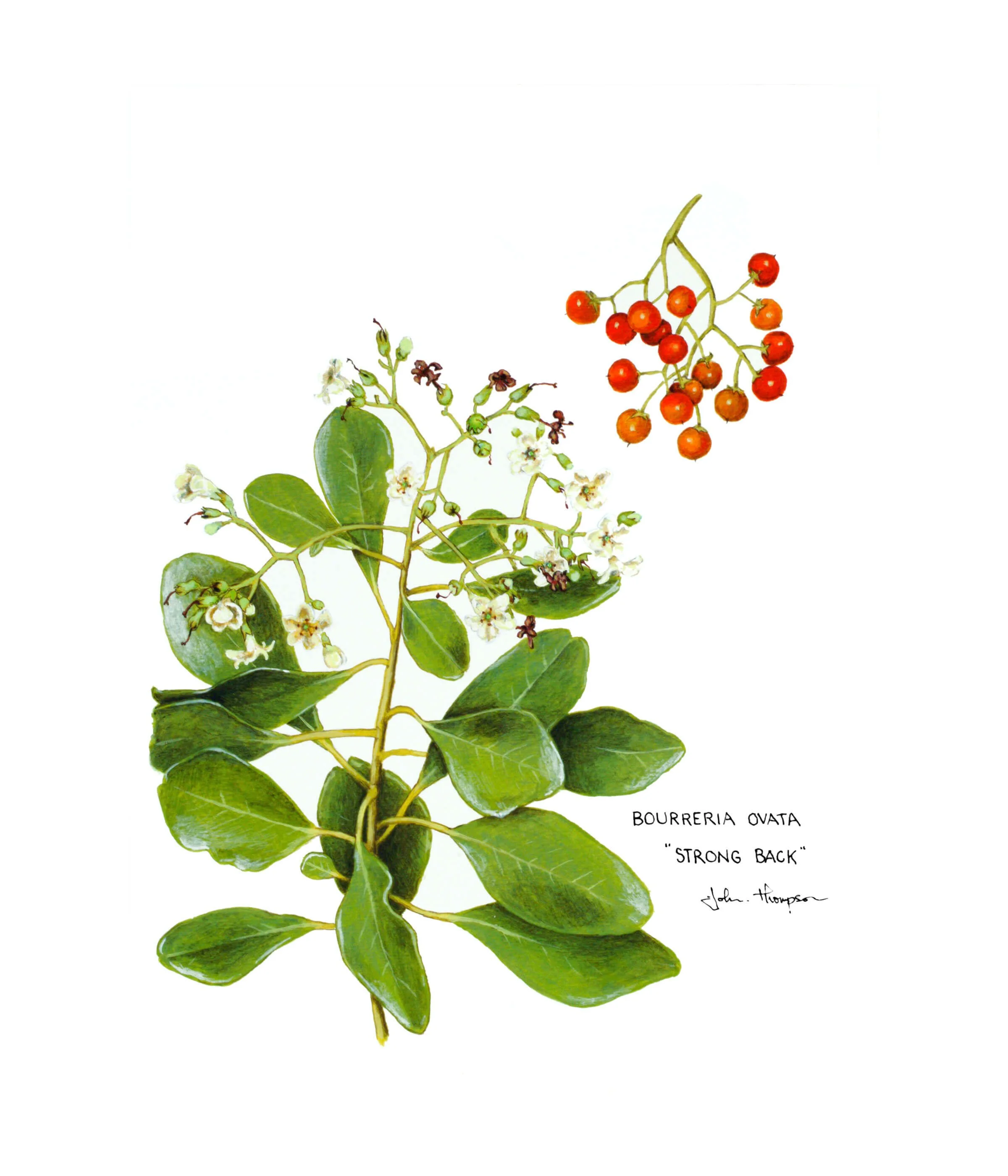 Botanical illustration of Bourreria ovata plant with green leaves, small white flowers, and red berries labeled 'Strong Back.'