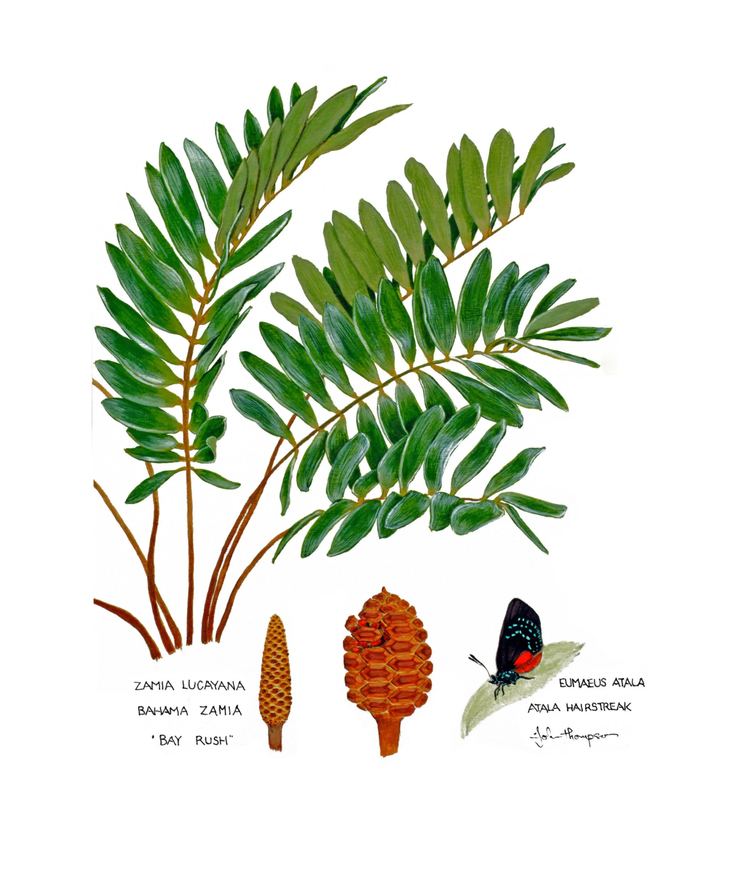 Illustration of Zamia lucayana plant with leaves, cones, and an Eumaeus atala butterfly.