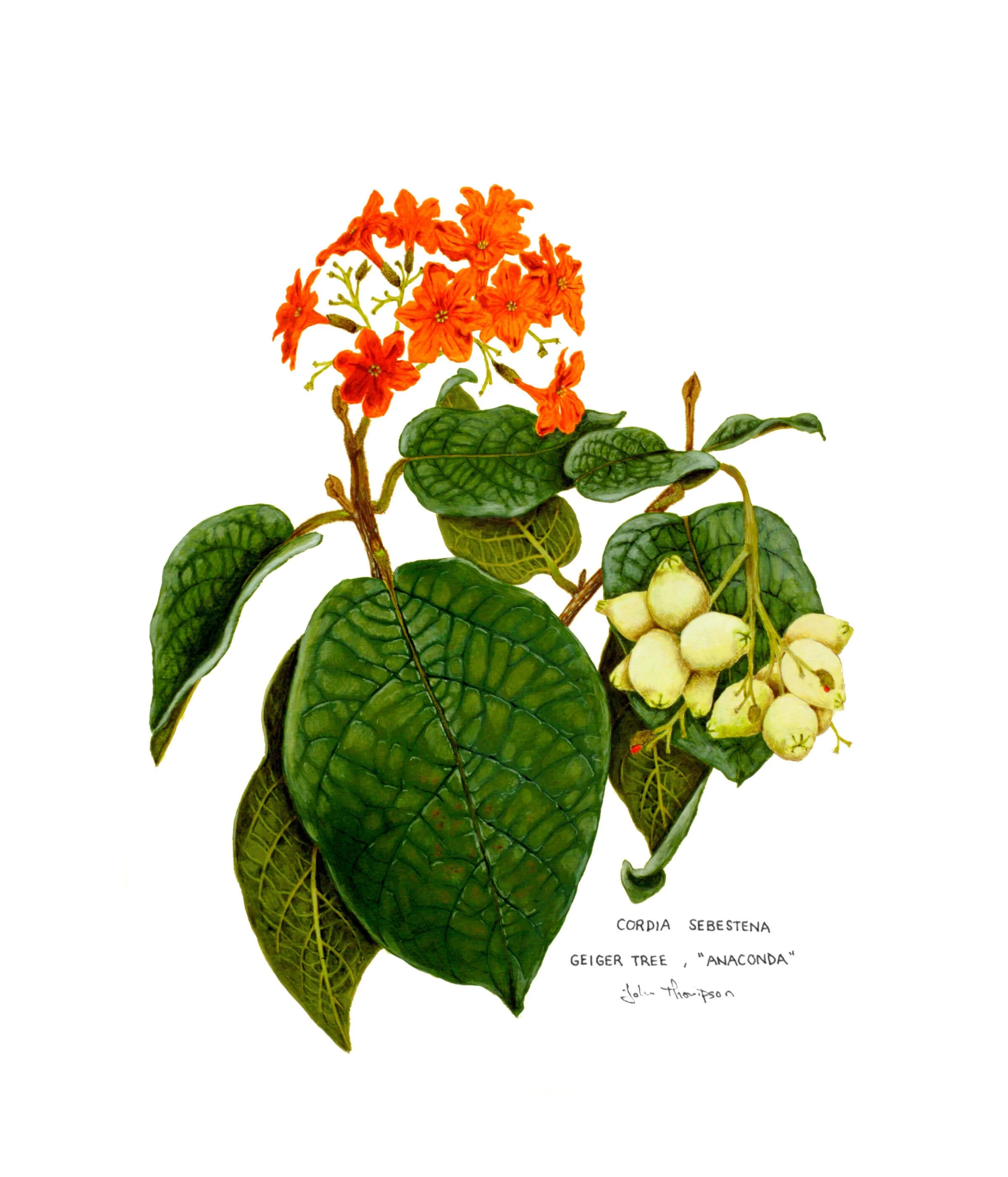 Illustration of Cordia sebestena, also known as Geiger Tree, featuring vibrant orange flowers and green leaves on a white background.
