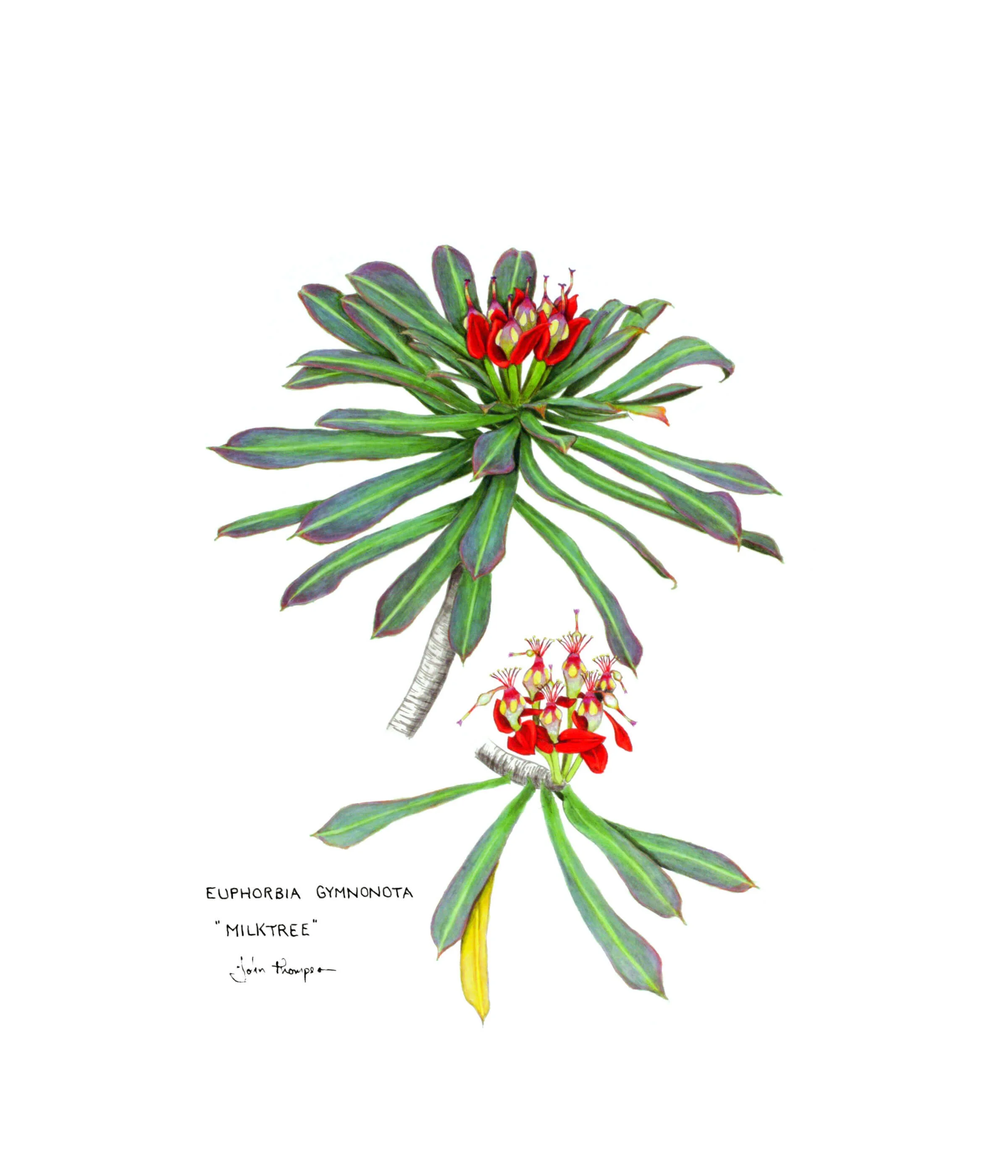 Botanical illustration of Euphorbia gymnonota, also known as 'Milktree', featuring green leaves and red flowers.